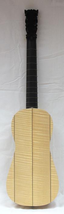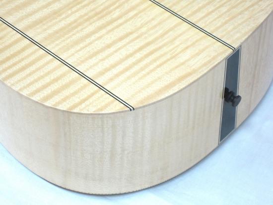 flat back of four-pieces with purfling and ribs of one-piece in curly maple