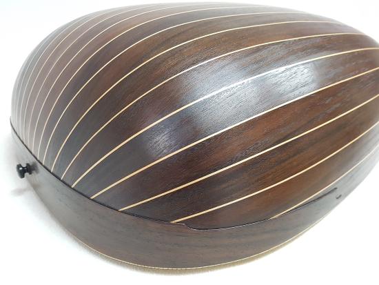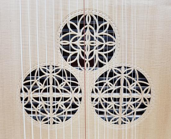 body with 23 (or 41 ribs) in curly or birds-eye maple, indian rosewood, plum, yew, ebony or according to individual customer preferences
